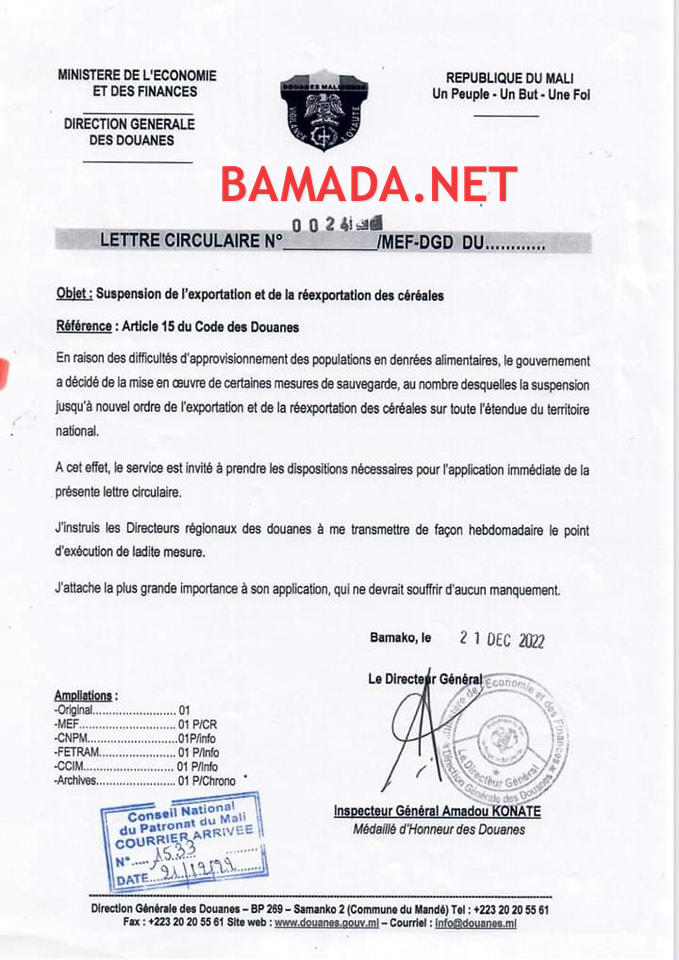 Lettre circulaire : Suspension de l’exportation et de la réexportation des céréales Source : Direction Générale des Douanes