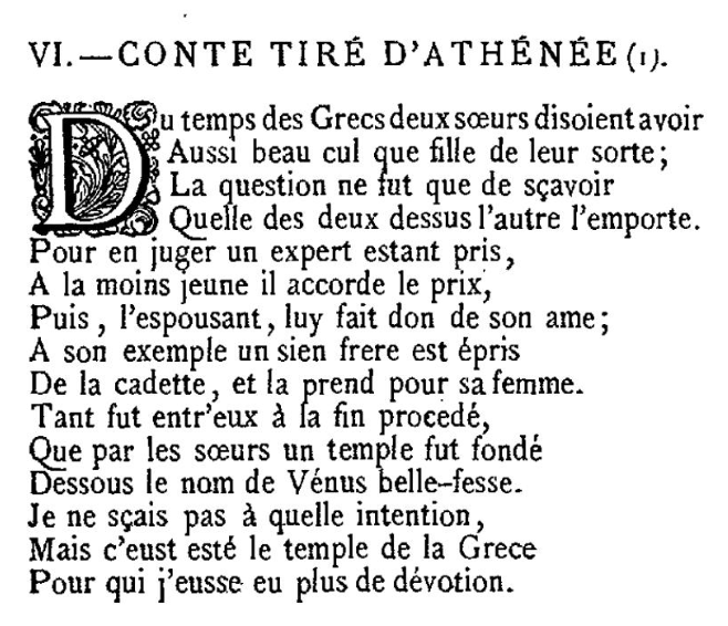 Il y avait à la campagne, non loin de Syracuse, cité grecque de Sicile, deux jeunes sœurs qui possédaient des postérieurs d’une exceptionnelle perfection. Un jour, elles se mettent à les comparer et chacune proclame qu’elle en possède un plus beau que sa sœur. Le débat s’envenime. Elles se rendent alors en ville, y croisent un jeune citoyen et lui demandent de les départager en évaluant leurs fessiers. Puis elles relèvent leurs tuniques sous les yeux du juge improvisé qui, après les avoir bien observées, finit par rendre son verdict : les deux sœurs possèdent un extraordinaire postérieur, mais celui de l’aînée l’emporte à ses yeux.