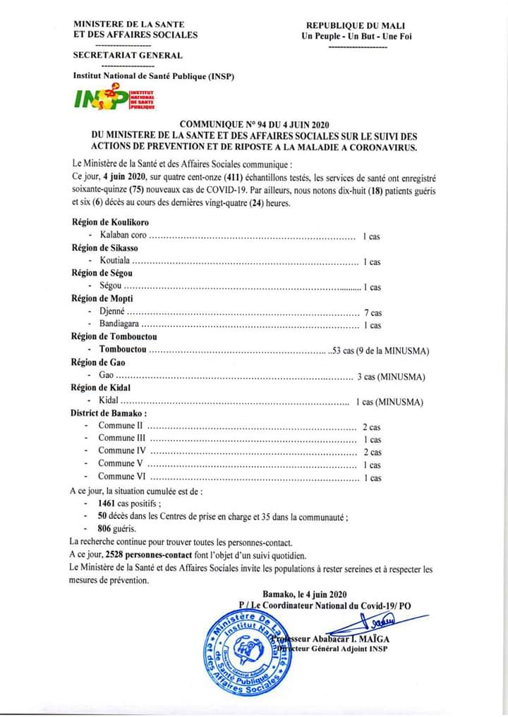 Le Mali a enregistré, ce jeudi 04 juin 2020, 75 nouveaux cas positifs de personnes atteintes de coronavirus, 18 patients guéris et 06 décès. Ce qui porte à 1461 le nombre total de cas positifs de Covid-19 dans notre pays. Les cas ont été recensés en: Commune II (02 cas) Commune III (01 cas); Commune IV (02 cas); Commune V (01 cas); Commune VI (01 cas); Gao (03 cas); Koutiala (01 cas); Kalaban-coro (01 cas); Ségou (01 cas); Djenné (07 cas); Bandiagara (01 cas); Tombouctou (53 cas).
